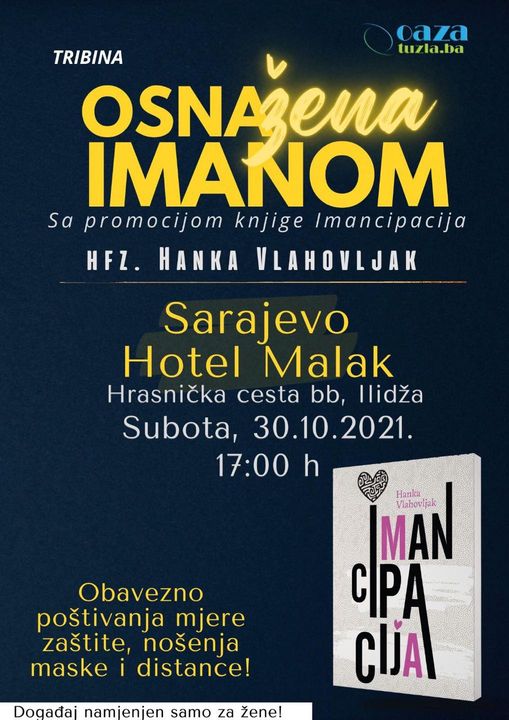 Categories Ženski sektorAlem Okanovic22.10.2021Osnažena imanom – Sa promocijom knjige Imancipacija 0 likes 451 views 0 Snažan vjernik je Allahu draži od nejakog, stoji u poznatom hadisu. Bujrum naredne subote u hotel Malak na Ilidži, u 17:00h, da skupa ojačamo najvažniju srčanu snagu, uz zvaničnu promociju knjige Imancipacija, u organizaciji udruženja Oaza iz Tuzle. Tags ženski sektor